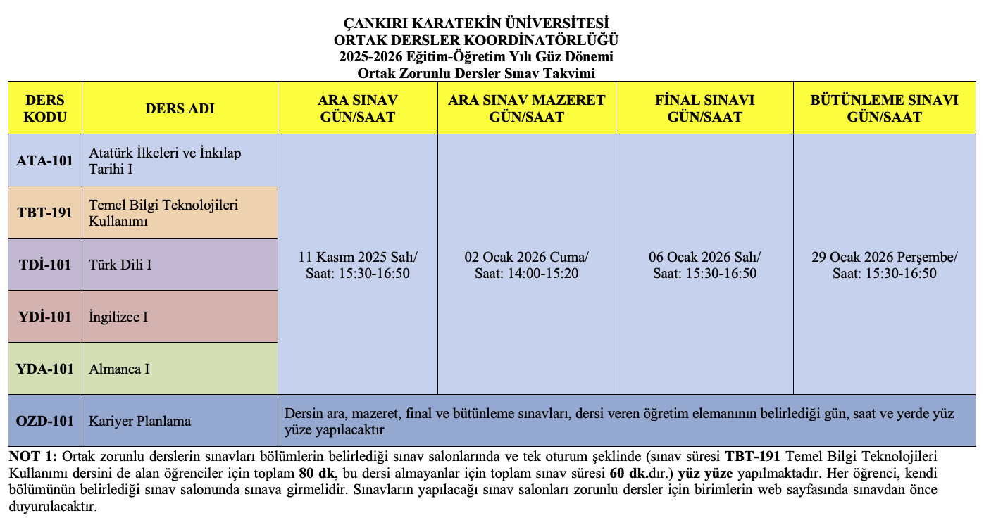 2025-2026 Eğitim-Öğretim Yılı Güz Dönemi Ortak Zorunlu Dersler Sınav Takvimi
